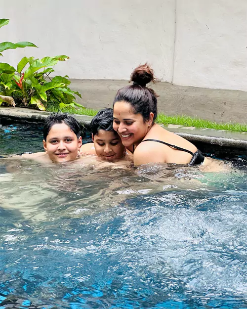 అనసూయ సోషల్ మీడియాలో యాక్టివ్ గా ఉంటుంది. వీకెండ్ పార్టీలని, హోమ్ టూర్ అని, సమ్మర్ వేకేషన్ అంటూ తన ప్రతీ అప్డేడ్ ని ఇన్ స్టాగ్రామ్ లో పోస్ట్ చేస్తుంటుంది. అయితే నిన్న మొన్నటిదాకా విజయ్ దేవరకొండ ఫ్యాన్స్ తో గొడవ పడుతూ పోస్ట్ లు చేసిన అనసూయ.. ఆ గొడవ సద్దుమణిగిందనేలోపే మళ్ళీ హాట్ టాపిక్ గా మారింది. జ్యువలరీ ప్రమోషన్స్, శారీ ప్రమోషన్స్ అంటూ బ్రాండ్స్ కోసం ప్రచారం చేస్తూ బిజీగా ఉంటున్న అనసూయ.. వీకెండ్ ప్లాన్స్ అంటూ శుక్రవారం నుండే ఇన్ స్టాగ్రామ్ లో తన అప్డేడ్స్ ని షేర్ చేస్తూ వచ్చింది. అయితే ఇప్పుడు తాజాగా తన ఇన్ స్టాగ్రామ్ లో తన ఫ్యామిలీతో స్విమ్మింగ్ ఫూల్ దగ్గర దిగిన ఏడు ఫోటోలని షేర్ చేసింది. అనసూయ ఫ్యామిలీతో ఉంది కదా ఫోటోలు మాములుగానే ఉంటాయనుకుంటే పొరపాటే.