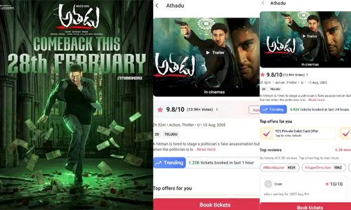 ఈ ఫిబ్రవరి 28న 'అతడు' సెకండ్ రీ-రిలీజ్ కి రెడీ అయింది. ఇప్పటికే బుకింగ్స్ ఓపెన్ అయ్యాయి. ప్రస్తుతం తక్కువ థియేటర్లలోనే బుకింగ్స్ ఓపెన్ అయినప్పటికీ.. అప్పుడే బుక్ మై షోలో ట్రెండింగ్ లోకి రావడం విశేషం. ఇక పూర్తిస్థాయిలో బుకింగ్స్ ఓపెన్ అయితే.. ఏ రేంజ్ రెస్పాన్స్ వస్తుందో ఊహించుకోవచ్చు.
