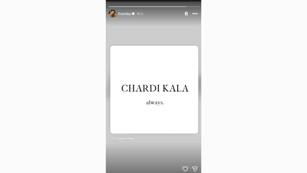హన్సిక తన పోస్ట్లో "చార్దీ కలా ఆల్వేస్" (Chardi Kala Always) అని రాసుకొచ్చింది. 'చార్దీ కలా' ఒక పంజాబీ పదం. దీని అర్థం ఏంటంటే.. ఎప్పుడూ ఉత్సాహంగా ఉండాలి. పరిస్థితులు ఎంత కష్టంగా ఉన్నా, ఎప్పుడూ ఉత్సాహంగా, సానుకూల దృక్పథంతో ముందుకు సాగాలని ఆమె ఈ పోస్ట్ ద్వారా చెప్పకనే చెప్పింది.