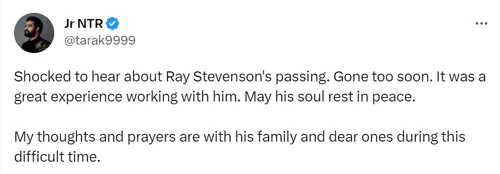 రే స్టీవెన్సన్ మృతి పట్ల దర్శకుడు ఎస్.ఎస్. రాజమౌళి సంతాపం తెలిపారు. "ఈ వార్తను నమ్మలేకపోతున్నాను. ఆయన సెట్స్ లో ఉంటే ఎంతో ఉత్సాహంగా ఉంటుంది. అతనితో పని చేయడం చాలా ఆనందంగా ఉంది. ఆయన ఆత్మకు శాంతి కలగాలని కోరుకుంటున్నాను" అని రాజమౌళి ట్వీట్ చేశారు. జూనియర్ ఎన్టీఆర్ కూడా "రే స్టీవెన్సన్ మరణవార్త విని షాక్ అయ్యాను. ఆయనతో పనిచేయడం గొప్ప అనుభవం. ఆయన ఆత్మకు శాంతి కలగాలని కోరుకుంటున్నాను" అని ట్వీట్ చేశారు.