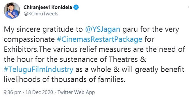 తెలుగు ఫిల్మ్ ఇండస్ట్రీకి ఉద్దీపన కలిగించడంలో భాగంగా ఎగ్జిబిటర్లకు ప్రత్యేక ప్యాకేజీ ప్రకటించిన ఆంధ్రప్రదేశ్ ముఖ్యమంత్రి వై.ఎస్. జగన్మోహన్ రెడ్డికి మెగాస్టార్ చిరంజీవి ధన్యవాదాలు తెలియజేశారు. "సినిమా రీస్టార్ట్ ప్యాకేజీలో భాగంగా ఎగ్జిబిటర్స్ను ఆదుకునేందుకు కనికరంతో ముందుకు వచ్చిన జగన్మోహన్ రెడ్డిగారికి నా హృదయపూర్వక ధన్యవాదాలు. థియేటర్ల మనుగడ కోసం ఈ విధమైన ఉపశమన చర్యలు అవసరం. దీని వల్ల మొత్తం తెలుగు ఫిల్మ్ ఇండస్ట్రీకి, దానిమీద ఆధారపడి జీవనం సాగిస్తున్న వేలాది కుటుంబాలకు గొప్ప ప్రయోజనం చేకూరుతుంది." అని చిరంజీవి ట్వీట్ చేశారు.