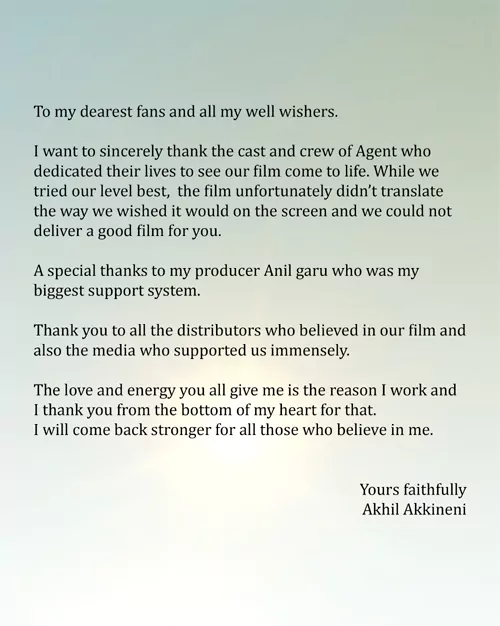 "ఏజెంట్ కోసం అంకిత భావంతో పని చేసిన ప్రతి ఒక్కరికి కృతఙ్ఞతలు తెలుపుతున్నాను. మేం మంచి చిత్రాన్ని అందించడానికి కృషి చేశాము కానీ అందులో విజయం సాధించలేకపోయాము. నాకు ఎంతో సపోర్ట్ గా నిలిచిన ప్రొడ్యూసర్ అనిల్ గారికి ప్రత్యేక కృతఙ్ఞతలు. అలాగే మా సినిమాని నమ్మిన డిస్ట్రిబ్యూటర్స్ కి, మాకు సపోర్ట్ చేసిన మీడియాకి ధన్యవాదాలు. నా మీద నమ్మకం ఉంచిన వారందరి కోసం మరింత కష్టపడి స్ట్రాంగ్ కమ్ బ్యాక్ ఇస్తాను" అని అఖిల్ రాసుకొచ్చాడు.