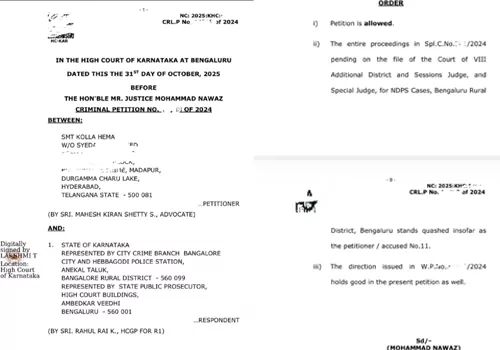 2024 మే నెలలో బెంగళూరు రేవ్ పార్టీ వ్యవహారంలో నటి హేమపై కేసు నమోదైన సంగతి తెలిసిందే. ఆమె డ్రగ్స్ తీసుకున్నట్లు అప్పట్లో పెద్ద ఎత్తున వార్తలు చక్కర్లు కొట్టాయి. అయితే ఆ వార్తలను అప్పుడే హేమ ఖండించారు. తాను ఏ తప్పు చేయలేదని, నిజం నిలకడమీద తెలుస్తుందని అన్నారు. అన్నట్టుగానే సంవత్సరం పాటు న్యాయపోరాటం తర్వాత ఎట్టకేలకు ఆమెకు కోర్టు నుండి గుడ్ న్యూస్ అందింది.