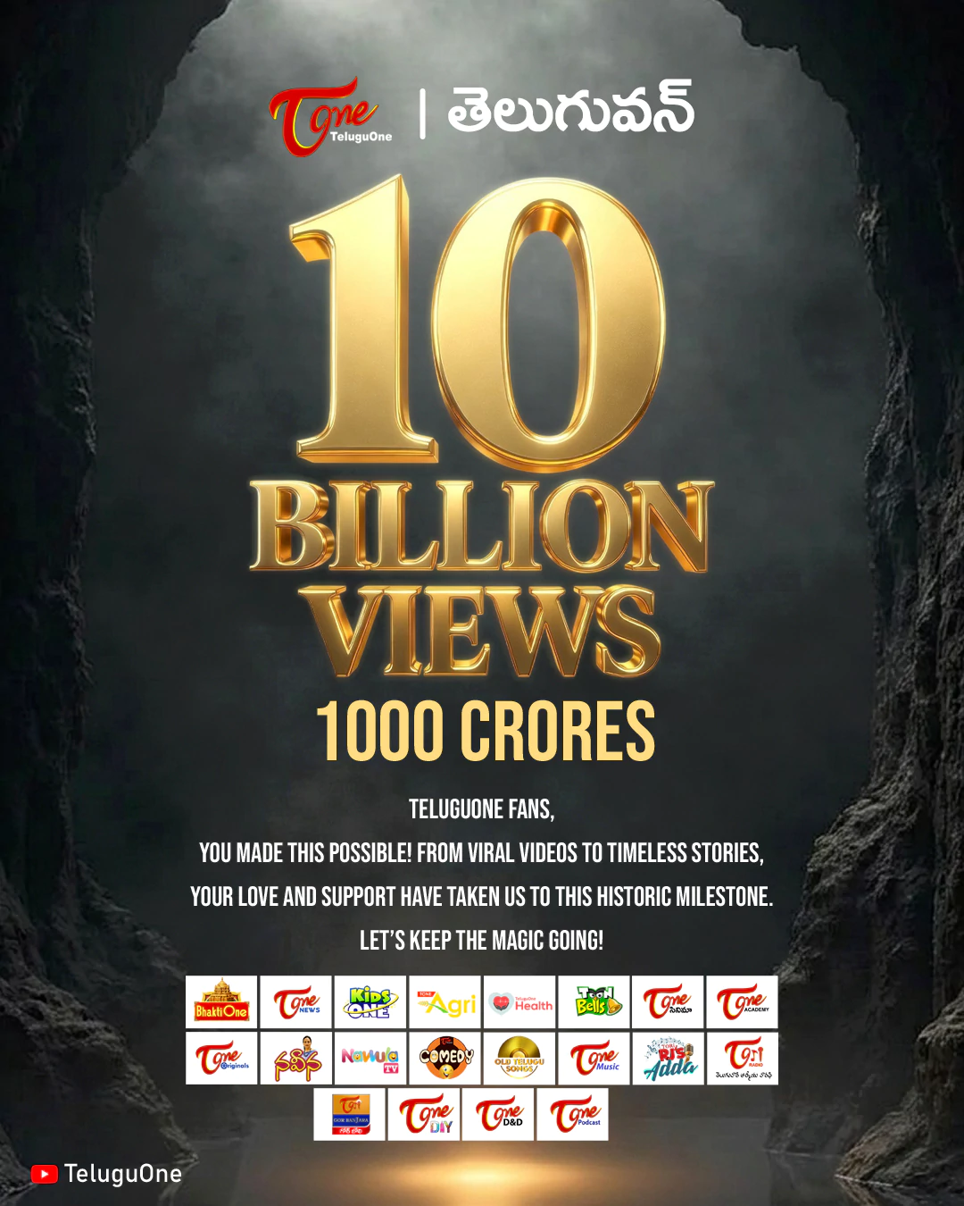 భారతదేశపు తొలి యూట్యూబ్ ఛానెళ్లలో ఒకటిగా 'తెలుగువన్' పేరు చిరస్థాయిగా నిలిచిపోయింది. ఎప్పటికప్పుడు నూతన సాంకేతికతను అందిపుచ్చుకుంటూ. వైవిధ్యమైన కంటెంట్ తో రెండు దశాబ్దాలుగా ప్రేక్షకుల ఆదరాభిమానాలు పొందుతున్న 'తెలుగువన్', ఇప్పటికే ఎన్నో మైలురాళ్లను అందుకుంది. తాజాగా మరో చారిత్రాత్మక మైలురాయిని చేరుకుంది. 1000 కోట్ల వ్యూస్ (10 బిలియన్ వ్యూస్)ను సాధించి, యూట్యూబ్ చరిత్రలో అత్యంత అరుదైన ఘనతను సొంతం చేసుకుంది.