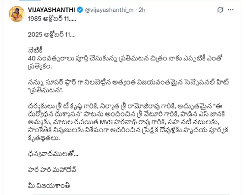 తెలుగు సినీ చరిత్రలో 'ప్రతిఘటన' చిత్రానికి ప్రత్యేక స్థానముంది. విజయశాంతి ప్రధాన పాత్రలో టి.కృష్ణ దర్శకత్వంలో ఉషాకిరణ్ మూవీస్ నిర్మించిన ఈ సినిమా.. 1985 అక్టోబర్ 11న విడుదలై సంచలనం సృష్టించింది. విజయశాంతిని లేడీ సూపర్ స్టార్ గా నిలబెట్టింది. నటీనటుల గొప్ప నటన, అద్భుతమైన కథాకథనాలు, మాటలు, పాటలు కలిసి ఈ సినిమాని గొప్పగా మలిచాయి. ఇందులోని 'ఈ దుర్యోధన దుశ్శాసన' పాట ఇప్పటికీ గూస్ బంప్స్ తెప్పిస్తుంది. ఈ సినిమా ఏకంగా ఆరు నంది అవార్డులతో సత్తా చాటింది. ఉత్తమ నటిగా విజయశాంతి, ఉత్తమ విలన్ గా చరణ్ రాజ్, ఉత్తమ గాయనిగా ఎస్.జానకి, ఉత్తమ కథా రచయితగా టి.కృష్ణ, ఉత్తమ మాటల రచయితగా హరనాథ్ రావుతో పాటు కోట శ్రీనివాసరావు స్పెషల్ జ్యూరీ అవార్డు అందుకున్నారు. ఇలా ఎన్నో సంచనాలు సృష్టించిన 'ప్రతిఘటన' చిత్రం, నేటితో 40 వసంతాలు పూర్తి చేసుకుంది. ఈ సందర్భంగా విజయశాంతి, సోషల్ మీడియా వేదికగా తన ఆనందాన్ని పంచుకున్నారు.