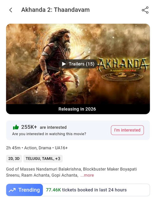 తాజాగా బుక్ మై షోలో అఖండ-2 సినిమా 2026లో విడుదల కానున్నట్లుగా చూపిస్తోంది. దీంతో అందరూ షాక్ లో ఉన్నారు. ఈ సినిమా 2026 సంక్రాంతికి విడుదలయ్యే అవకాశముందని తెలుస్తోంది. అందుకే బుక్ మై షోలో 2026 లో విడుదల కానున్నట్లు సూచిస్తుందని సమాచారం. మరి అఖండ-2 నిజంగానే సంక్రాంతికి విడుదలవుతుందా లేదా? అనేది మరికొద్ది సేపట్లో క్లారిటీ వచ్చే ఛాన్స్ ఉంది.