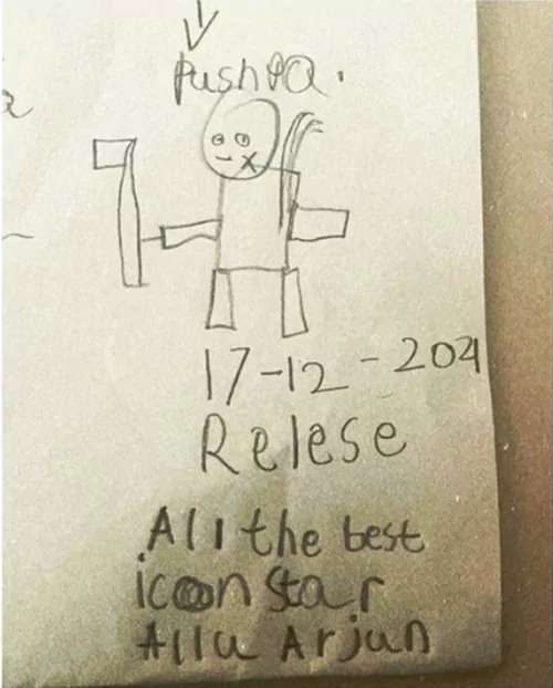 పుష్ప విడుదల సందర్భంగా ఈ ఉదయం అయాన్ తను డిజైన్ చేసిన ఒక కార్డుతో బన్నీని సర్ ప్రైజ్ చేశాడు. ఆ కార్డులో గొడ్డలి పట్టుకొని ఉన్న పుష్ప బొమ్మ పెన్సిల్ తో గీసి ఉంది. అలాగే, పుష్ప రిలీజ్ డేట్(17-12-2021)తో పాటు.. 'అల్ ది బెస్ట్ ఐకాన్ స్టార్ అల్లు అర్జున్' అని రాసి ఉంది. తనయుడు తనకోసం గీసిన ఆర్ట్ చూసి బన్నీ మురిసిపోయాడు. ఆ కార్డు ఫోటోని సోషల్ మీడియాలో షేర్ చేసిన బన్నీ.. "థ్యాంక్యూ చిన్ని బాబు.. లవ్యూ అయాన్.. ఈ కార్డుతో ఈ ఉదయాన్ని మరింత స్పెషల్ గా మార్చావు" అని రాసుకొచ్చాడు.