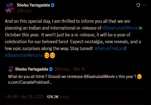 He wrote on X, "And on this special day, I am thrilled to inform you all that we are planning an Indian and international re-release of @BaahubaliMovie in October this year. It won't just be a re-release, it will be a year of celebration for our beloved fans! Expect nostalgia, new reveals, and a few epic surprises along the way. Stay tuned! #ReliveTheEpic! #BaahubaliReturns"