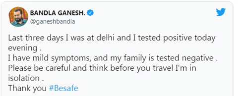 "గత మూడు రోజులు నేను ఢిల్లీలో ఉన్నాను. స్వల్ప లక్షణాలు ఉండటంతో పరీక్షలు చేయించుకోగా ఆదివారం సాయంత్రం కరోనా పాజిటివ్ అని తేలింది. నా కుటుంబ సభ్యులకు నెగిటివ్ వచ్చింది. ప్రస్తుతం నేను ఐసోలేషన్ లో ఉన్నాను. అందరూ జాగ్రత్తగా ఉండండి. ప్రయాణాలు చేసేముందు ఒక్కసారి ఆలోచించుకోండి" అంటూ బండ్ల గణేష్ ట్వీట్ చేశారు.