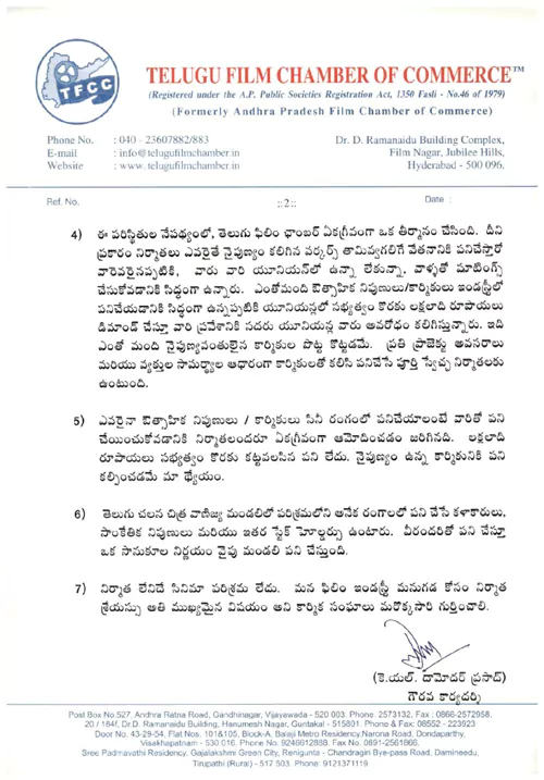 4) ఈ పరిస్థితుల నేపథ్యంలో, తెలుగు ఫిలిం చాంబర్ ఏకగ్రీవంగా ఒక తీర్మానం చేసింది. దీని ప్రకారం నిర్మాతలు ఎవరైతే వైపుణ్యం కలిగిన వర్కర్స్ తామివ్వగలిగే వేతనానికి పనిచేస్తారో వారెవరైనప్పటికి వారి యూసయన్లో ఉన్నా లేకున్నా వాళ్ళతో షూటింగ్స్ చేసుకోవడానికి సిద్ధంగా ఉన్నారు. ఎంతోమంది ఔత్సాహికులు ఇండస్ట్రీలో పనిచేయడానికి సిద్ధంగా ఉన్నప్పటికీ.. యూనియన్లలో సభ్యత్వం కొరకు లక్షలాది రూపాయలు డిమాండ్ చేస్తూ వారి ప్రవేశానికి సదరు యూనియన్లు వారు అవరోధం కలిగిస్తున్నారు. ఇది ఎంతో మంది నైపుణ్యవంతులైన కార్మికుల పొట్ట కొట్టడమే. ప్రతి ప్రాజెక్టు అవసరాలు మరియు వ్యక్తుల సామర్థ్యాల ఆధారంగా కార్మికులతో కలిసి పనిచేసే పూర్తి స్వేచ్చ నిర్మాతలకు ఉంటుంది.