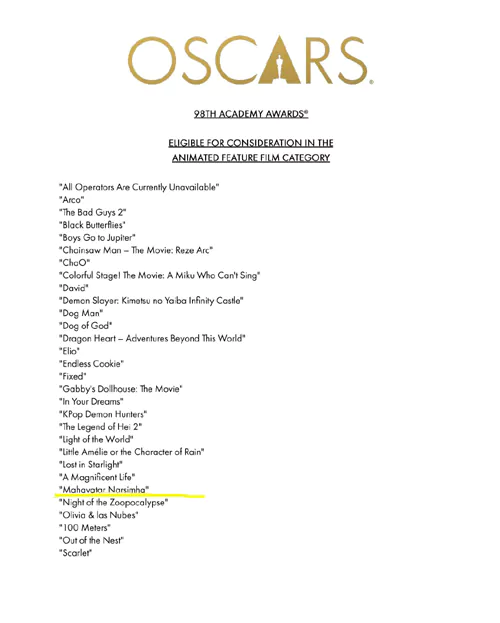తాజాగా 'మహావతార్ నరసింహ' మరో ఘనత సాధించింది. 98వ ఆస్కార్ అవార్డుల బరిలో ఈ చిత్రం నిలిచింది. ఉత్తమ యానిమేటెడ్ ఫీచర్ ఫిల్మ్ విభాగంలో ప్రపంచవ్యాప్తంగా ఎంపికైన 35 సినిమాలలో ఒకటిగా 'మహావతార్ నరసింహ' నిలిచింది. ఈ విభాగంలో ఆస్కార్ గెలిచి, చరిత్ర సృష్టించాలని.. భారతీయ సినీ అభిమానులు కోరుకుంటున్నారు. (Oscars 2026)
