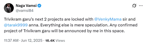 త్రివిక్రమ్ చేయబోయే నెక్స్ట్ మూడు ప్రాజెక్ట్ లలో వెంకటేష్, రామ్ చరణ్, జూనియర్ ఎన్టీఆర్ లు హీరోలుగా నటిస్తారని ప్రచారం జరిగింది. అయితే వీటిలో చరణ్ ప్రాజెక్ట్ విషయంలో బిగ్ ట్విస్ట్ వచ్చింది. ఆ ప్రాజెక్ట్ లాక్ కాలేదని అర్థమొచ్చేలా తాజాగా నిర్మాత నాగవంశీ ఓ ట్వీట్ చేశారు. "త్రివిక్రమ్ గారి తదుపరి 2 ప్రాజెక్టులు వెంకటేష్ గారు, ఎన్టీఆర్ అన్నతో లాక్ అయ్యాయి. మిగతావన్నీ కేవలం ఊహాగానాలు. త్రివిక్రమ్ గారిది ఏదైనా ప్రాజెక్ట్ కన్ఫర్మ్ అయితే స్వయంగా మేమే ప్రకటిస్తాము." అని నాగవంశీ రాసుకొచ్చారు.