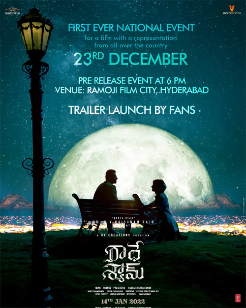 రెబల్ స్టార్ ప్రభాస్ హీరోగా కె.రాధాకృష్ణ కుమార్ దర్శకత్వంలో రూపొందుతోన్న సినిమా 'రాధేశ్యామ్'. పూజా హెగ్డే హీరోయిన్ గా నటిస్తున్న ఈ సినిమా సంక్రాంతి కానుకగా జనవరి 14 న ప్రేక్షకుల ముందుకు రానుంది. ఈ నేపథ్యంలో మూవీ టీమ్ ప్రమోషన్స్ స్టార్ట్ చేసింది. అందులోభాగంగా డిసెంబర్ 23 న హైదరాబాద్ లో భారీ వేడుకను నిర్వహించేందుకు సిద్ధమవుతున్నారు మేకర్స్. ఈ మేకర్స్ తాజాగా అధికారికంగా తెలియజేస్తూ ఒక పోస్టర్ ను విడుదల చేశారు.