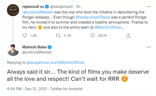 రాజమౌళి ట్వీట్ కి మహేష్ రిప్లై ఇచ్చారు. మీ చేసే సినిమాలకు ప్రేమ, గౌరవం పొందే అర్హత ఉంది. మీ 'ఆర్ఆర్ఆర్' ఫిల్మ్ కోసం ఎంతో ఆసక్తిగా చూస్తున్నానని మహేష్ తెలిపారు.