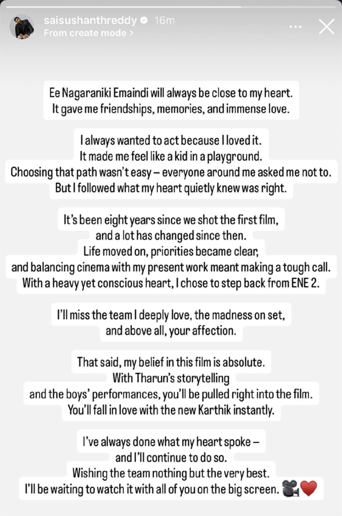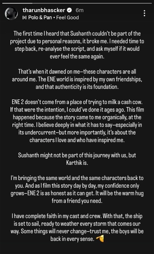 "వ్యక్తిగత కారణాల వల్ల 'ఈ నగరానికి ఏమైంది-2'లో నటించలేనని సుశాంత్ చెప్పినప్పుడు బాధ కలిగింది. అయితే ఈ స్క్రిప్ట్ మీద, ఈ క్యారెక్టర్స్ మీద నాకు నమ్మకం ఉంది. 'ఈ నగరానికి ఏమైంది' ప్రపంచం అనేది నిజ జీవితంలో నా ఫ్రెండ్స్ తో అనుభవాల నుంచి పుట్టింది. 'ఈ నగరానికి ఏమైంది-2' స్టోరీ కూడా ఆర్గానిక్ గా వచ్చిందే. ఇందులో సుశాంత్ లేనప్పటికీ కార్తీక్ పాత్ర మిమ్మల్ని మునుపటిలాగానే అలరిస్తుంది." అని తరుణ్ భాస్కర్ చెప్పుకొచ్చాడు.