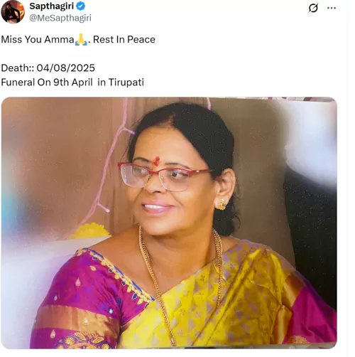 ప్రముఖ నటుడు సప్తగిరి ఇంట తీవ్ర విషాదం చోటు చేసుకుంది. సప్తగిరి తల్లి చిట్టెమ్మ కన్నుమూశారు. కొంతకాలంగా అనారోగ్యంతో బాధపడుతున్న ఆమె, బెంగళూరులోని ఓ ప్రైవేట్ ఆస్పత్రిలో చికిత్స పొందుతూ మంగళవారం తుదిశ్వాస విడిచారు. ఈ బాధాకర సంఘటన గురించి సప్తగిరి సోషల్ మీడియాలో ''Miss You Amma" అని పోస్ట్ చేశారు. అలాగే ఈరోజు తిరుపతిలో అంత్యక్రియలు జరగనున్నాయని తెలిపారు.