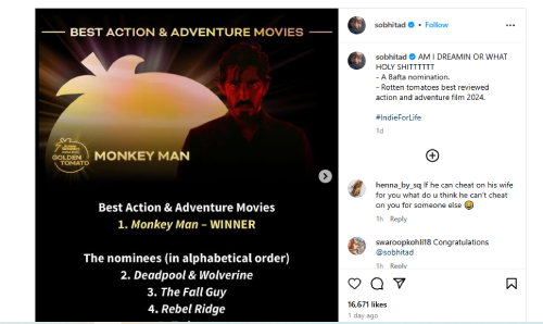 Directed by Dev Patel, Monkey Man is an intense action thriller about an ex-convict seeking redemption in a corrupt, chaotic world. The film’s success marks a significant achievement for Sobhita and the team, further cementing her presence on the international stage.