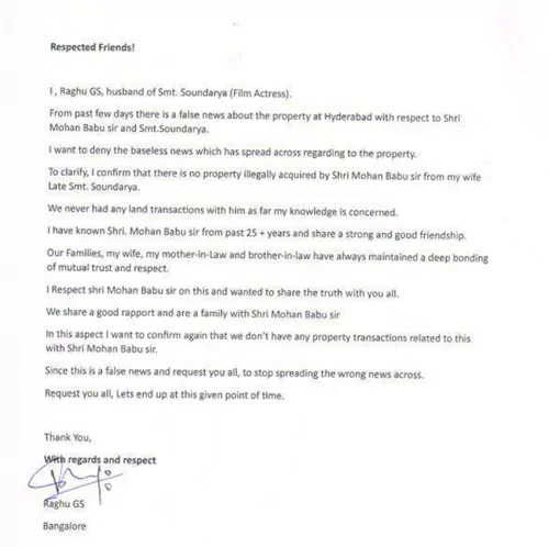"మోహన్ బాబు గారు మరియు సౌందర్యకు సంబంధించి హైదరాబాద్లోని ఆస్తి గురించి గత కొన్ని రోజులుగా తప్పుడు వార్తలు వస్తున్నాయి. ఈ వార్తలను నేను ఖండిస్తున్నాను. నా భార్య సౌందర్య నుంచి మోహన్ బాబు గారు ఎటువంటి ఆస్తిని అక్రమంగా తీసుకోలేదని స్పష్టం చేస్తున్నాను. నాకు తెలిసినంత వరకు మేము ఆయనతో ఎలాంటి భూ లావాదేవీలు జరపలేదు. గత 25 సంవత్సరాల నుండి మోహన్ బాబు గారితో మాకు మంచి అనుబంధం ఉంది. ఇలాంటి తప్పుడు వార్తలను ప్రచారం చేయకండి." అని రఘు రాసుకొచ్చారు.