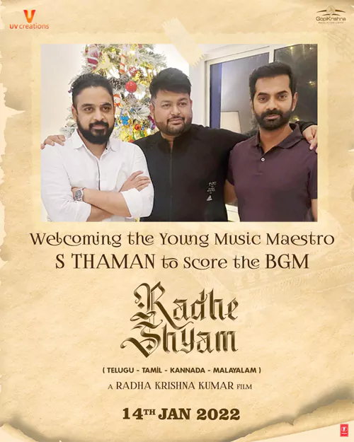 రాధేశ్యామ్ సినిమాకి జస్టిన్ ప్రభాకర్ సంగీతం అందించిన విషయం తెలిసిందే. ఇప్పటికే విడుదలైన సాంగ్స్ ఆకట్టుకున్నాయి. అయితే ఈ సినిమాకు బ్యాక్ గ్రౌండ్ మ్యూజిక్ కోసం సెన్సెషనల్ మ్యూజిక్ డైరెక్టర్ తమన్ ని రంగంలోకి దింపింది మూవీ టీమ్. తెలుగు, తమిళం, కన్నడ, మలయాళ భాషలకు తమన్ బీజీఎం అందిస్తాడని తాజాగా యూవీ క్రియేషన్స్ అధికారికంగా ప్రకటించింది.