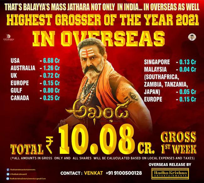 'వకీల్ సాబ్' మూవీ ఓవర్సీస్లో రమారమి రూ. 10 కోట్ల గ్రాస్ వసూలు సాధించగా, 'అఖండ' తొలివారానికే రూ. 10.08 కోట్ల గ్రాస్ను వసూలుచేసి, ఈ ఏడాది ఓవర్సీస్లో అత్యధిక వసూళ్లు సాధించిన తెలుగు సినిమాగా నిలిచింది. ఇందులో ఒక్క యు.ఎస్.ఎ. వాటానే రూ. 6.68 కోట్లు. ఆస్ట్రేలియాలోనూ రూ. 1.26 కోట్ల గ్రాస్ రావడం విశేషంగా చెప్పుకోవాలి.
