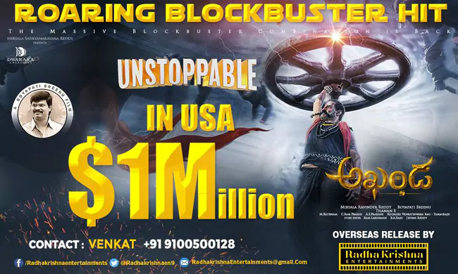ఓవర్సీస్లో 'అఖండ'ను రాధాకృష్ణ ఎంటర్టైన్మెంట్స్ రిలీజ్ చేసింది. ఆ డిస్ట్రిబ్యూషన్ కంపెనీకి ఇదే ఫస్ట్ ఫిల్మ్ కావడం గమనార్హం. తొలి చిత్రంతోనే వారు మిలియన్ మార్క్ను అందుకున్నారు. ఆస్ట్రేలియా, యూకే, గల్ఫ్ ఏరియాల్లోనూ 'అఖండ'కు అనూహ్యమైన వసూళ్లు వస్తున్నాయి.