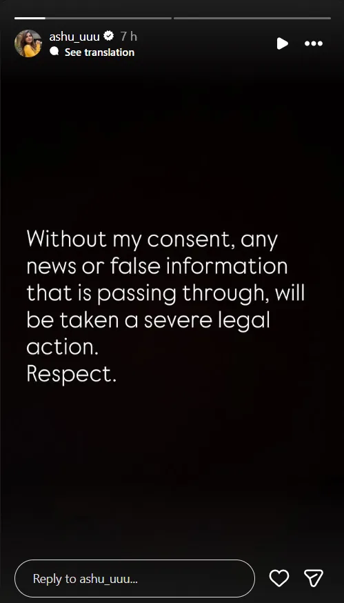 తనపై వస్తున్న ఈ భారీ ఆరోపణలపై అషురెడ్డి సోషల్ మీడియా వేదికగా స్పందించారు. తన ఇన్స్టాగ్రామ్ స్టోరీలో ఒక హెచ్చరిక జారీ చేశారు. "నా ప్రమేయం లేకుండా, నా అనుమతి లేకుండా నా గురించి ఏ వార్త రాసినా లేదా తప్పుడు ప్రచారం చేసినా వారిపై కఠినమైన చట్టపరమైన చర్యలు తీసుకుంటాను." అని రాసుకొచ్చారు.