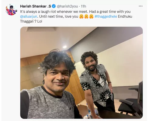 తాజాగా బన్నీని కలిసిన హరీష్.. ఆయనతో ఓ ఫోటో దిగి ట్విట్టర్ లో షేర్ చేశాడు. అంతేకాదు,'మేమిద్దరం ఎప్పుడు కలిసిన సరదాగా ఉంటుంది. బన్నీతో గ్రేట్ టైం గడిపాను. తగ్గేదేలే.. ఎందుకు తగ్గాలి?' అంటూ హరీష్ ట్వీట్ చేశాడు. ప్రస్తుతం ఈ ట్వీట్ వైరల్ గా మారింది.