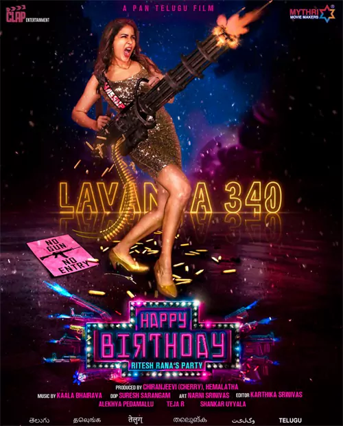 నేడు(డిసెంబర్ 15) లావణ్య త్రిపాఠి పుట్టినరోజు సందర్భంగా మూవీ ఫస్ట్ లుక్ ని, టైటిల్ ని రివీల్ చేశారు. 'హ్యాపీ బర్త్ డే లావణ్య త్రిపాఠి' అంటూ విషెస్ తెలిపిన మూవీ టీమ్.. మూవీ టైటిల్ కూడా 'హ్యాపీ బర్త్ డే' అని పెట్టడం విశేషం. టైటిల్ కి తగ్గట్లే ఫస్ట్ లుక్ పోస్టర్ కూడా ఆసక్తికరంగా డిజైన్ చేశారు. మోడ్రన్ డ్రెస్ లో ఉన్న లావణ్య చేతిలో పెద్ద గన్ను పట్టుకొని షూట్ చేస్తూ కనిపించింది. అలాగే పోస్టర్ లో 'నో గన్.. నో ఎంట్రీ' అనే బోర్డు ఉంది. పోస్టర్ లో పార్టీ(సెలబ్రేషన్) మూడ్ కనిపిస్తోంది.