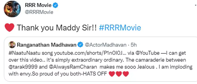 అతను ఇంకా "జూనియర్ ఎన్టీఆర్, రామ్చరణ్ మధ్య ఉన్న స్నేహం నాకు చాలా అసూయ కలిగిస్తుంది. నేను అసూయలో మునిగిపోతున్నాను. మీ ఇద్దరినీ చూస్తుంటే చాలా గర్వంగా ఉంది-హాట్స్ ఆఫ్." అని రాసుకొచ్చాడు. RRR మేకర్స్ మాధవన్కి వెంటనే థాంక్స్ అంటూ రిప్లై ఇచ్చారు.