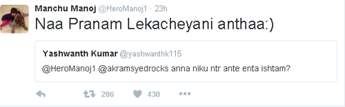 జూనియర్ ఎన్టీఆర్, మంచు మనోజ్ల ఫ్రెండ్షిప్ గురించి ప్రత్యేకంగా చెప్పక్కర్లేదు. తెలుగు చిత్ర పరిశ్రమలో ప్రాణస్నేహితులుగా చెప్పే వారిలో ఖచ్చితంగా ముందువరుసలో ఉండే జంట వీరిది. యాదృచ్ఛికంగా ఇద్దరూ ఒకే రోజు పుట్టడం, దానికి తోడు చిన్నప్పటి నుంచి కలిసి పెరగడంతో ఇద్దరు ప్రాణస్నేహితులుగా మారారు. ఏళ్లు గడుస్తున్నకొద్ది ఆ బంధం ఇంకా బలపడుతూనే ఉంది. ఈ నేపథ్యంలో ఎన్టీఆర్పై తనకున్న ప్రేమను మరోసారి చాటిచెప్పాడు మనోజ్. అన్నా మీకు ఎన్టీఆర్ అంటే ఎంత ఇష్టం అని ట్విట్టర్ వేదికగా ఓ అభిమాని అడిగిన ప్రశ్నకు నా ప్రాణం లెక్కచేయనంత అని ట్వీట్ చేశాడు మనోజ్. ఇంకేముంది ఈ ట్వీట్ చూసిన ఎన్టీఆర్ అభిమానులు మనోజ్కు థాంక్స్ చెబుతూ నువ్వు సూపర్ అన్నా అంటూ కామెంట్స్ చేశారు.