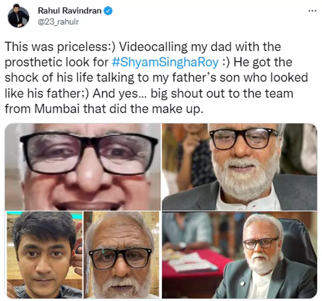 ఆ వీడియో కాల్ ఫొటోతో పాటు, 'శ్యామ్ సింగ రాయ్'లో తన ముసలి గెటప్ ఫొటోలు, తన ఇప్పటి ఫొటోను షేర్ చేసిన రాహుల్, "ఇది అమూల్యం. 'శ్యామ్ సింగ రాయ్'లోని ప్రాస్తటిక్ లుక్తో మా నాన్నకు వీడియో కాల్ చేశాను. తన తండ్రిలాగే ఉన్న కొడుకును చూసిన ఆయన షాకయ్యారు. అవును. ఈ మేకప్ చేసిన ముంబై టీమ్కు బిగ్ థాంక్స్." అని రాసుకొచ్చాడు రాహుల్.