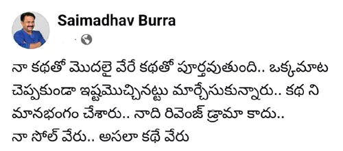 సరస్వతి మూవీకి బుర్రా సాయి మాధవ్(Saimadhav Burra)'కథ' ని అందించడం జరిగింది. ఈ మేరకు టైటిల్ కార్డులో మేకర్స్ ప్రస్తావించారు. రీసెంట్ గా ఈ విషయంపై సోషల్ మీడియా వేదికగా ఆయన స్పందిస్తు 'సరస్వతి' నా కథతో మొదలై వేరే కథతో పూర్తవుతుంది. ఒక్క మాట చెప్పకుండా ఇష్టమొచ్చినట్టుగా మార్చేసుకున్నారు. ఒక రంగంగా కథని మానభంగం చేసారు. నాది రివెంజ్ డ్రామా కాదు. నా సోల్, నా కథ వేరని తెలిపాడు. ఇప్పుడు ఈ మాటలు సినీ సర్కిల్స్ తో పాటు మూవీ లవర్స్ లో వైరల్ గా నిలిచాయి. సాయి మాధవ్ ఎన్నో అగ్ర చిత్రాలకి మాటలని అందించాడు. బాలకృష్ణ(Balakrishna),వరలక్ష్మి శరత్ కుమార్ అన్నా చెల్లెళ్లు గా కనపడిన వీర సింహారెడ్డికి సాయిమాధవ్ నే డైలాగ్ రైటర్.