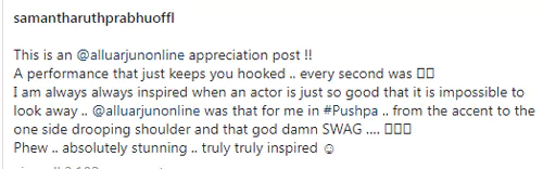 'పుష్ప' సినిమాలో బన్నీ నటనని ప్రశంసిస్తూ తాజాగా సమంత ఇన్ స్టాగ్రామ్ లో ఓ పోస్ట్ పెట్టింది. "పుష్ప మూవీలో బన్నీ ప్రతిక్షణం ప్రేక్షకులను కట్టిపడేసేలా నటించారు. ఒక యాక్టర్ అసాధారణ నటన కనబరిస్తే.. ఆ నటన నుంచి నేను ఎప్పుడూ స్ఫూర్తిని పొందుతాను. పుష్ప మూవీలో భుజాన్ని వేలాడేస్తూ బన్నీ కనబరిచిన అద్భుతమైన నటన నిజంగా స్ఫూర్తిదాయకం." అంటూ సమంత చెప్పుకొచ్చింది. సమంత పోస్ట్ ప్రస్తుతం సోషల్ మీడియాలో వైరల్ గా మారింది. స్టార్ హీరోయిన్ గా గుర్తింపు తెచ్చుకున్న సమంత.. ఒక స్టార్ ని ఈ స్థాయిలో పొగడ్తలతో ముంచెత్తడం ఆశ్చర్యం కలిగిస్తోంది. బన్నీ అద్భుత నటనే సమంతని ఇలా మాట్లాడేలా చేసింది అంటూ బన్నీ ఫ్యాన్స్ మురిసిపోతున్నారు.