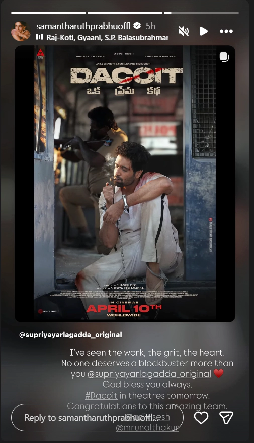 అడివి శేష్, మృణాల్ ఠాకూర్ జంటగా నటించిన రొమాంటిక్ యాక్షన్ థ్రిల్లర్ ‘డెకాయిట్’ (Dacoit). అన్నపూర్ణ స్టూడియోస్ సమర్పణలో సుప్రియ యార్లగడ్డ ఈ చిత్రాన్ని నిర్మించారు. ‘డెకాయిట్’ మూవీ రేపు(ఏప్రిల్ 10) ప్రేక్షకుల ముందుకు రానుంది. అయితే అక్కినేని కాంపౌండ్ నుండి వస్తున్న ఈ సినిమాకు అనూహ్యంగా స్టార్ హీరోయిన్ సమంత(Samantha) మద్దతు లభించింది. సోషల్ మీడియా వేదికగా సమంత చేసిన ఒక పోస్ట్ ఇప్పుడు హాట్ టాపిక్‌గా మారింది.