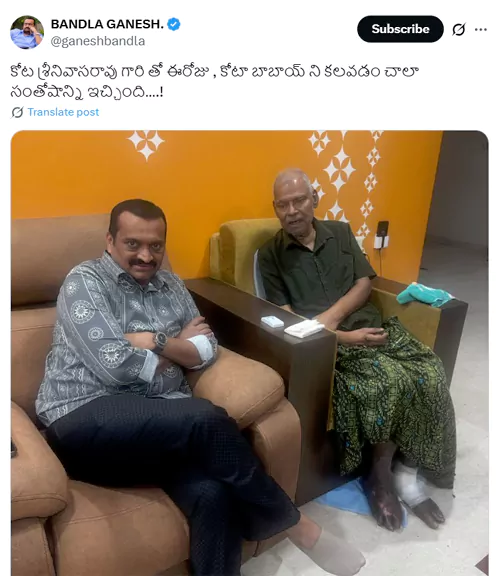 నటుడు, నిర్మాత బండ్ల గణేష్ "కోట శ్రీనివాసరావు గారితో ఈరోజు, కోటా బాబాయ్ ని కలవడం చాలా సంతోషాన్ని ఇచ్చింది." అంటూ తాజాగా కోట శ్రీనివాసరావుతో దిగిన ఫొటోని సోషల్ మీడియాలో పంచుకున్నాడు. ఆ ఫొటోలో చాలా రోజులకు కోట కనిపించడంతో అభిమానులు సంతోషం వ్యక్తం చేస్తున్నారు. అదే సమయంలో ఆయన కాళ్ళు చూసి ఆవేదన చెందుతున్నారు. కోట శ్రీనివాసరావు ఒక కాలికి కట్టు కట్టి ఉంది, మరో కాలేమో వాచినట్టుగా కనిపిస్తోంది. మనిషి కూడా చాలా బక్కగా కనిపిస్తున్నారు. "కోట గారికి ఏమైంది? ఆయనను ఇలా చూడటం బాధగా ఉంది. కోట గారు కోలుకొని మునుపటిలా ఉండాలని కోరుకుంటున్నాము." అని అభిమానులు కామెంట్లు పెడుతున్నారు.