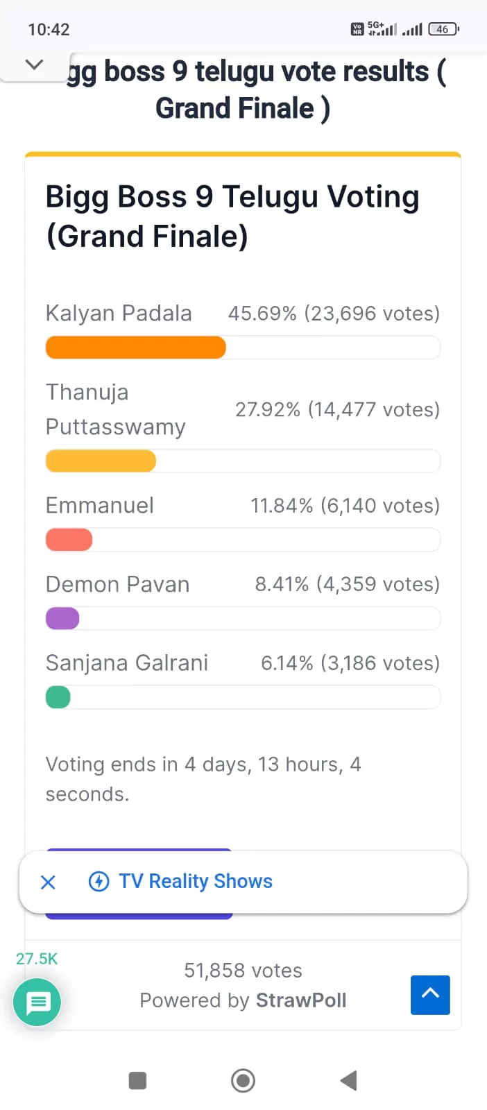 అన్ అఫీషియల్ ఓటింగ్ పోల్ లో.. పవన్ కళ్యాణ్ పడాలకి అత్తధిక ఓటింగ్ నమోదవ్వగా.. సంజనకి లీస్ట్ ఓటింగ్ పడింది. 45.69 శాతం ఓటింగ్ తో పవన్ కళ్యాణ్ పడాల మొదటి స్థానంలో ఉండగా, 27.92 శాతం లో ఓటింగ్ తో తనూజ రెండో స్థానంలో ఉంది. 11.84 శాతం ఓటింగ్ తో ఇమ్మాన్యుయేల్ మూడో స్థానంలో ఉన్నాడు. ఇక లీస్ట్ లో సంజన, డీమాన్ పవన్ ఉన్నారు. 8.41 శాతం ఓటింగ్ తో డీమాన్ పవన్ నాల్గవ స్థానంలో ఉన్నాడు. 6.14 శాతం ఓటింగ్ తో సంజన లీస్ట్ లో ఉంది.
