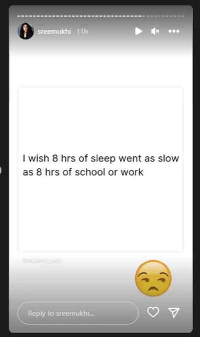 "నాకు 8 గంటల నిద్ర కావాలి అదీ ఎలా ఉండాలంటే స్కూల్ కి వెళ్ళినప్పుడు, జాబ్ కి వెళ్ళినప్పుడు 8 గంటలు ఎంత భారంగా గడుస్తాయో అంత లేట్ గా గడవాలి అనేది నా కోరిక" అంటూ ఎమోజితో పోస్ట్ చేసింది. కానీ అలా జరగదు కదా. ఇలా పాపం శ్రీముఖి నిద్ర కోసం ఎలా తపిస్తుందో అర్ధం చేసుకోవచ్చు.
