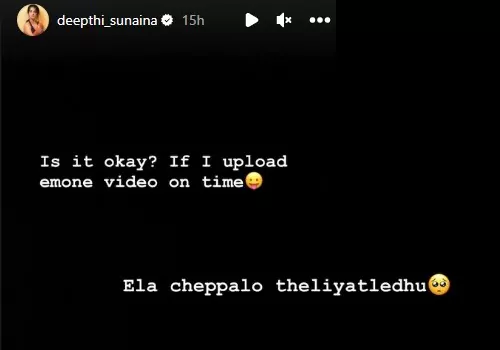 అలాగే తన కెరీర్కు సంబంధించిన ఎన్నో విషయాలు, విశేషాలను ఫాలోవర్లతో పంచుకుంటూ ఉంటుంది. ఇప్పుడు దీప్తి తన ఇన్స్టాగ్రామ్ స్టేటస్ కొన్ని ఇంటరెస్టింగ్ లైన్స్ ని పోస్ట్ చేసింది. "గైస్.. ఎలా చెప్పాలో తెలియట్లేదు' అంటూ పోస్ట్ చేసింది. దీంతో ఆమె అభిమానులు కంగారుపడ్డారు. తన మరో పోస్టులో 'ఏమోనే సాంగ్ టైంకి అప్లోడ్ చేస్తే పర్లేదు కదా ? తిట్టుకుంటున్నందుకు థ్యాంక్స్' అంటూ ఒక కామెడీ ట్విస్ట్ ఇచ్చింది. ఇలా దీప్తి కాసేపు సందడి చేసింది.