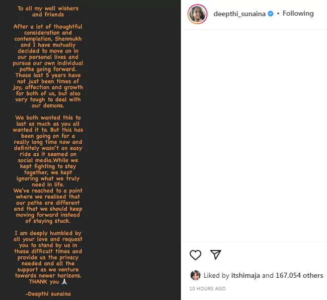 చాలా లోతుగా ఆలోచించిన మీదట, షణ్ముఖ్, నేను పరస్పరం మా వ్యక్తిగత జీవితంలో ముందుకు సాగాలని, ఎవరి సొంత వ్యక్తిగత మార్గాలను అనుసరించాలని నిర్ణయించుకున్నాం. గత 5 సంవత్సరాలు మా ఇద్దరికీ ఆనందాన్నీ, ఆప్యాయతనీ, ఎదుగుదలనీ అందించడమే కాదు, మా భూతాలతో వ్యవహరించడం చాలా కష్టమైంది.