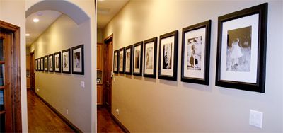 Photographs need not be in custom frames only, they can be hung to a cord , like clothes...they can be individually framed in few...a whole wall can be used to display one beside the other. Sometimes, one below the other, sometimes all aligned in square shape, too.