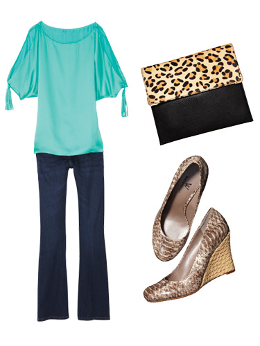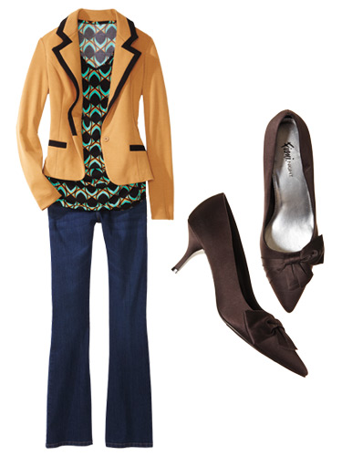 * Wearing a heel elevates the status of jeans from straight casual to smart casual. Leave the sky-high stilettos at home and choose a classic one- to two-inch pump in a dark colour for a long-legged look. Black is always a simple staple and lets the rest of the outfit shine.