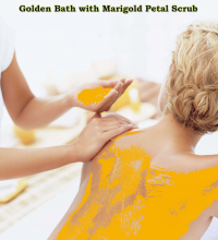 Golden Bath with Marigold Petal Scrub Marigold Bath Scrub: No Indian household is complete without the Marigold floral decoration and as the festivities end, these beautiful garlands adorning your door frames and walls are pulled down once they start drying. Those with gardens might keep some flowers and let them dry and use the seeds again for planting new marigold plants, while the rest are thrown away. Just like rose petals, the petals of the marigold flower are also used in beauty masks and packs. Marigold flower extract is used to prevent wrinkles by stimulating the collagen production in the body and also has anti-inflammatory and antibacterial properties. And you could use either the yellow or orange petals. Try this wonderful Marigold Bath Scrub using fresh marigold petals which are available easily in the local markets. This pack is great for those who have oily skin and helps in cleansing the greasiness from the body. What you need: A big cup of crushed fresh Marigold ( Yellow or orange) petals. ½ Tbs of dry Amla (gooseberry) powder. 1 Tbs of lemon juice. ½ Cup of fresh Curd . Procedure: Take ½ Tbs of Amla ( Gooseberry) powder, 1Tbs of lemon juice and the ½ cup of curd .Mix this into a paste. To this mixture add the crushed fresh Marigold petals to get a smooth consistency. You can crush the flowers in mortar and pestle (adding a few drops of water) so that you get a moist paste from the petals. You could first apply this mask to the face .Avoid the lips and under eye area and leave it to dry. Meanwhile take the rest of the paste and apply it all over the body in circular motions for about 15 to 20 minutes. Once you have applied it all over the body just leave it for 5 minutes so that the marigold pack sinks in. Wash of the pack with warm water and pat dry for that silky and golden feel!