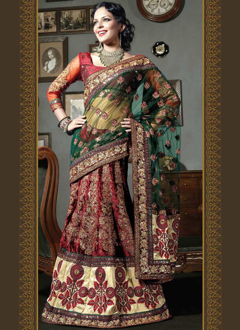 Green and maroon lehenga saree. Maroon lehenga is getting gorgeous with intricate sequined vertical floral pattern on the velvet base and maroon embroideried floral leafy pattern on a pale yellow georgette base at down. Green net pallu is flooded with fancy sequined motifs.
