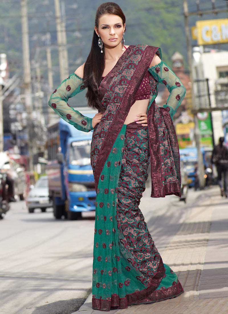 Green and dark pink dual tone patli pallu saree. First and second Half of the saree Intricately crafted with dual tone embroidered flowing brunch pattern. Pleats fascinated with sequin and embroidered swirl motifs. Heavy sequin embellished patch border is framing the saree. Fabric used is net.
