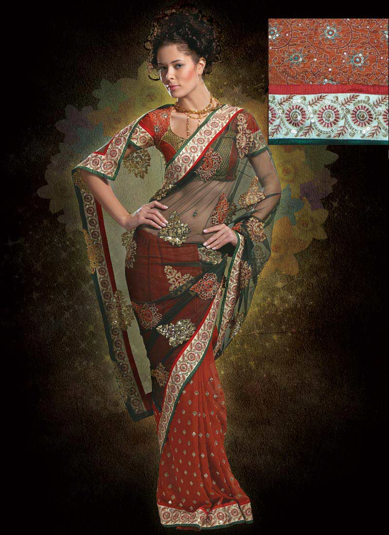 Flattering rust saree features cream patch made beautiful with sequins and resham embroidered design. The lower part of the sari features sequins and resham embroidered buttis.