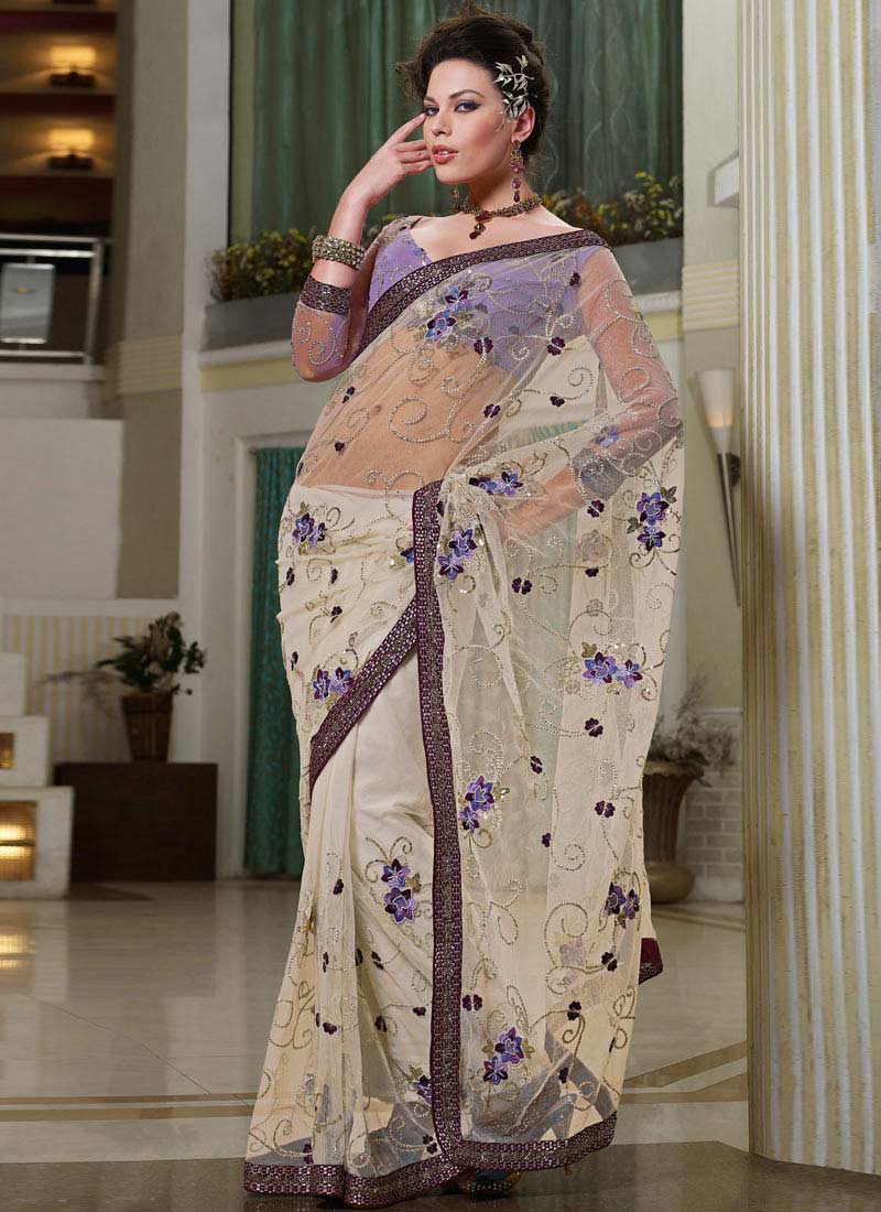 Off white saree. Accentured all over with magenta and purple floral pattern embroidery,sequin and pearl beads. Framed with a embroideried and sequined magenta patch border.