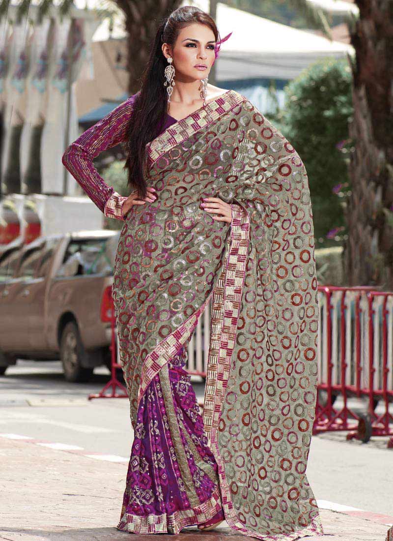 Half and half magenta and olive green shade dual tone saree. First half festooned with resham embroidered ,sequin round pattern with leaf pattern vertical patch panels. Second half of the saree adorned with tri tone sequin circle pattern. Framed with sequined patch border.