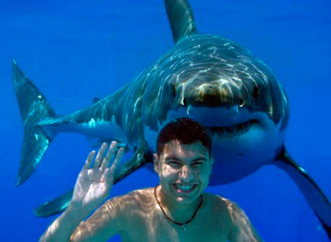 In the pool is a man and he is swimming as hard as he can, and the fins come out of the water and the jaws are snapping and this guy just keeps on going and the sharks are gaining on him and this guy reaches the end and he gets out of the pool, tired and soaked.