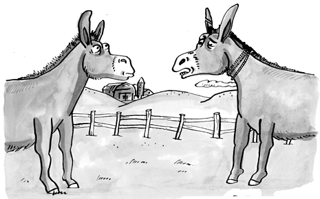 మరో గాడిద ఆగి అడిగింది"ఏంటి ఇక్కడ నించున్నావ్?”అని.