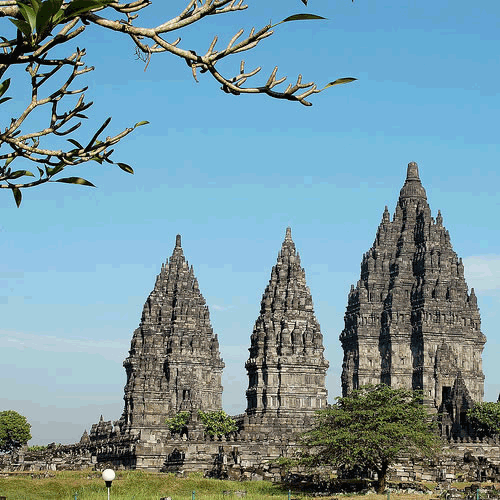 Prambanan is a Hindu temple in Central Java, Indonesia. The temple was built in 850 CE, and is composed of 8 main shrines and 250 surrounding smaller ones